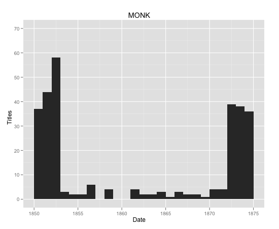 With the kind assistance of several folks at Indiana, I’ve now gotten my hands on IU’s full holdings of the digitized Wright American Fiction collection. This is the literary corpus spanning 1850-1875 from which the MONK texts that I used for my initial mapping project were drawn. But MONK chose to limit the size of their Wright-based corpus to around 300 volumes for reasons of balance across their several datasets.