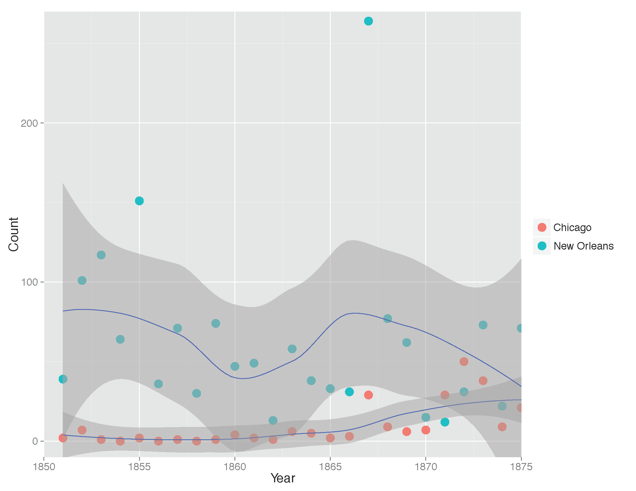 In short, those cities were about the same size in 1860, but New Orleans — the older of the two by far — was used much more often in fiction at the time. It appears to have taken a while for Chicago to catch on in the literary imagination.